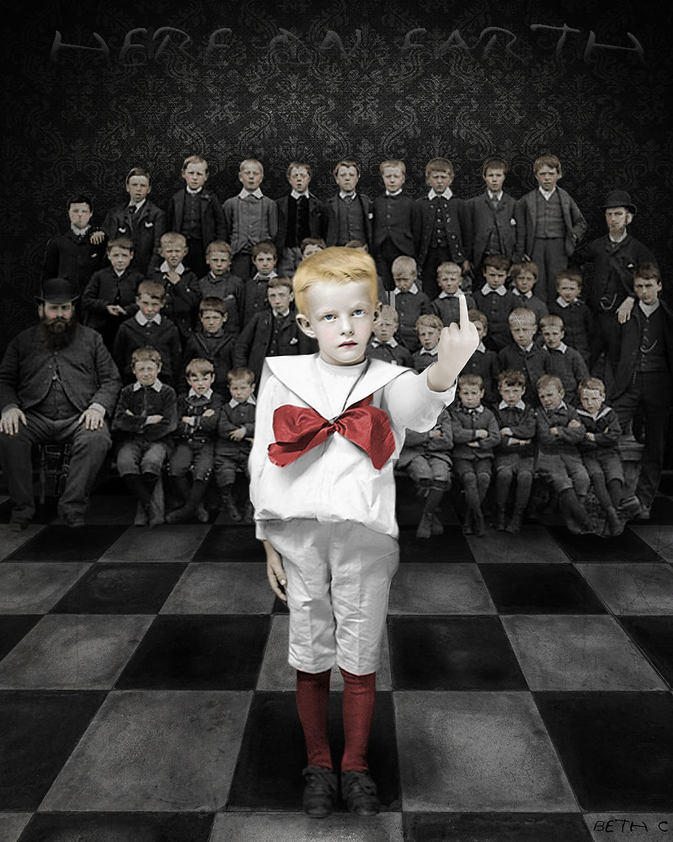 Beth draws inspiration from interesting old photographs: a child with a sad face, a hauntingly empty room, a lady with a mischievous look and she wants to give them new life… create a new story that maybe they didn’t get a chance to tell. Most of her work involves vintage photographs – recycled memories and faces and places that come together to create dark and beautiful dreamscapes.